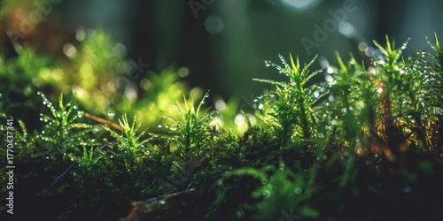 Green moss growing in forest with glistening water drops, representing nature, freshness, and growth