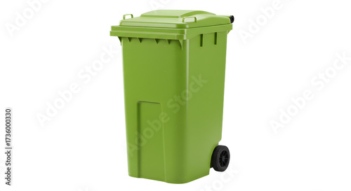 Green outdoor wheeled trash bin isolated on white background for waste management and recycling, perfect for environmental projects