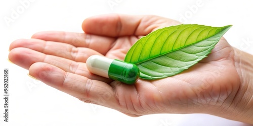 Green Pill in Hand with Leaf, Herbal Medicine, Natural Remedies, Wellness ,herbal supplement , natural healing , plant-based
