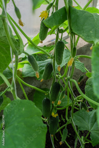 green pimpled thorny cucumbers grow on branches among the leaves in the greenhouse, harvest