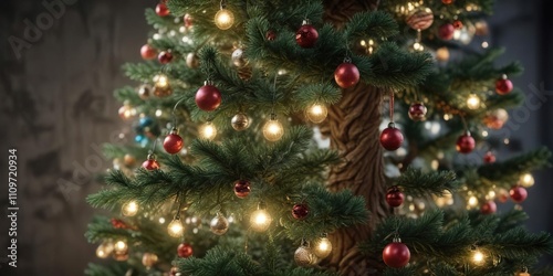 Green pine tree adorned with sparkling baubles and glittering lights, ornaments decoration, winter decor