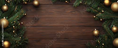 Green pine tree branches with garland and golden ornaments on wooden background.