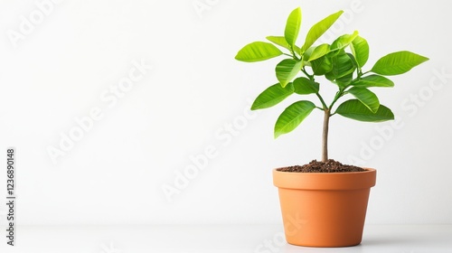 Green Plant in Brown Pot with Fresh Leaves on White Background