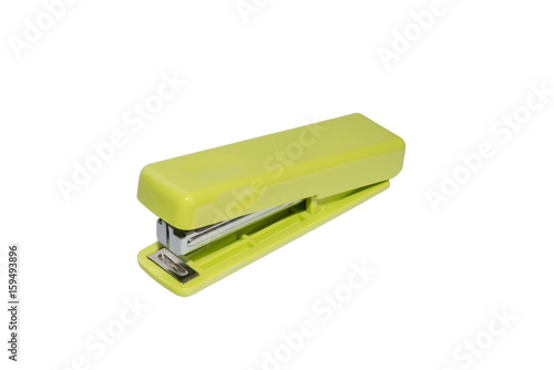 Green plastic stationery stapler isolated on white background