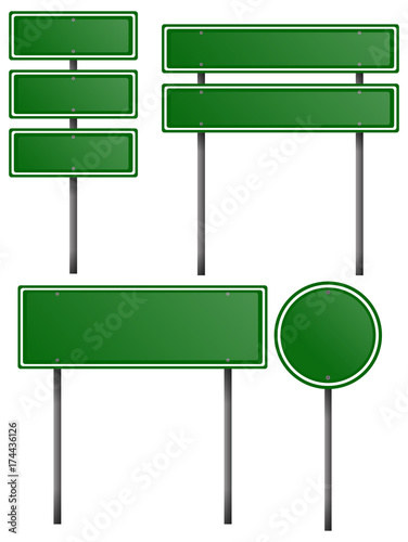 Green signs on metal posts