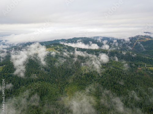 Green slopes of Ukrainian Carpathian mountains in summer. Cloudy morning, low clouds. Aerial drone view.