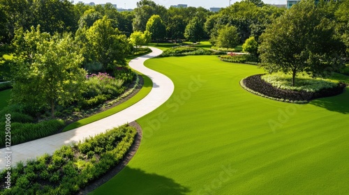Green spaces gardening concept. Lush green park with curved pathways and vibrant trees under a clear blue sky.
