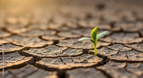 Green Sprout Emerging from Cracked Dry Earth at Sunrise
