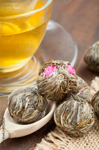 Green tea balls with flowers, tea cup and wooden spoon on kitche