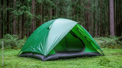 Green tent in a lush forest. Perfect for camping or hiking