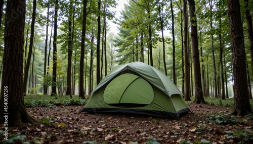Green Tent Set Up in a Lush Forest Surrounded by Tall Trees and Natural Beauty