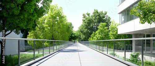 path, tree, green, paseo, building, city, light, daylight, modern, architecture, urban, corridor, vista, nature, landscape, alley, exterior, perspective, pathway, summer, facades, glasses, fence, concrete, wood, park, alleyway, walk, pedestrian, sunlit, vibrant, city landscape, clear