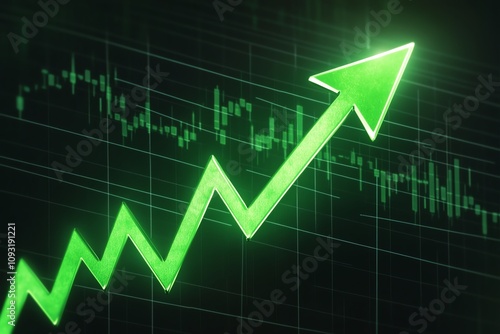 Green upward arrow symbolizing growth and positive trends in business or finance, digital stock market background.