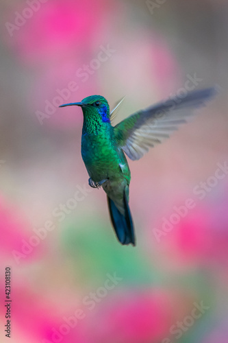Green Violet-ear (Colibri thalassinus) hummingbird in flight isolated on a green background in Costa Rica