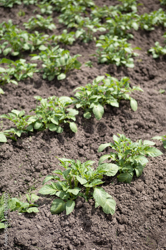 Green young potato plants (Solanum tuberosum) in row growing in garden on brown soil. Close up. Organic farming, healthy food, BIO viands, back to nature concept.