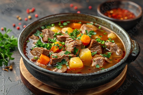 Greenlandic suaasat reindeer soup in paper bowl with root vegetables and herbs, traditional