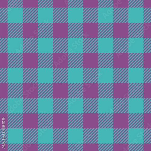 Greeting tartan background fabric, simple pattern check plaid. Styled textile texture seamless vector in purple and teal colors.