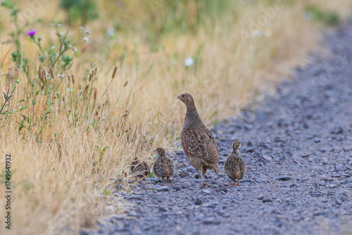 Grey Partridge (Perdix perdix) female with several fledgling on gravel road next to wildflower stripe, Hesse, Germany