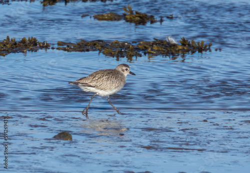 Grey plover on the edge of the shore feeding in the water and the seaweed in the sunshine, running through the water