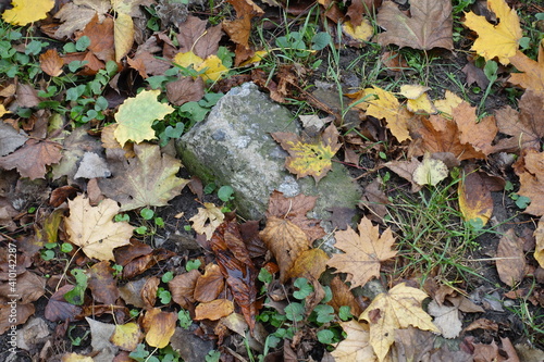 fallen, leaf, autumn, greenery, stone, background, nature, foliage, vegetation, flora, outdoors, plant, botany, bright, park, garden, forest, timberland, meadow, glade, herbaceous, candid, season, october, defoliation, abscission, dry, ground, cover, leafage, deciduous, green, yellow, gold, amber, brown, beige, grey, rock, concrete, urban, decay, block, acer, norge, maple, colourful