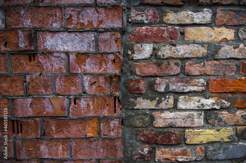 Grey white black red orange old vintage brick wall background. Rustic cemented dark brick house wall texture with grunge surface. Shabby Building Facade With Damaged Plaster. Aged weathered exterior