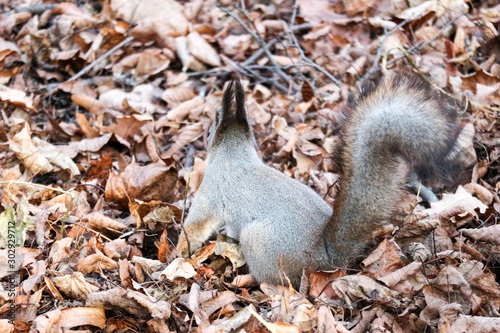 grey winter squirrel jumping in a brown fallen leaves