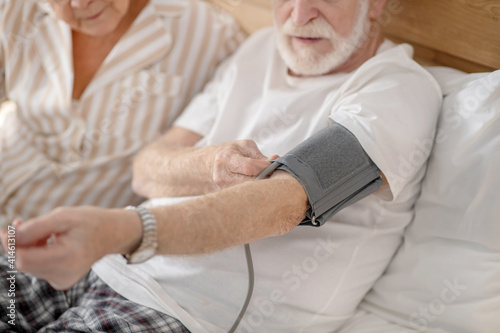 ageing, aged, caucasian, grey-haired, family, couple, married, senior, adult, home, indoor, apartment, domestic, two people, 70, bedchamber, retired, man, woman, female, male, husband, wife, health care, blood pressure, high-blood-pressure