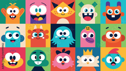 monster, cartoon, character, face, grid, colourful, vibrant, playful, cute, funny, silly, quirky, diverse, expression, emotion, happy, surprised, cheerful, friendly, whimsical, children, illustration, vector, graphic, design, pattern, background, square, row, column, orange, pink, yellow, blue, green, purple, red, white, black, eye, mouth, teeth, ear, horn, hat, crown, bow, beak, simple