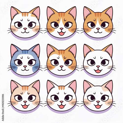 Grid of nine colorful cartoon cat faces with different expressions.