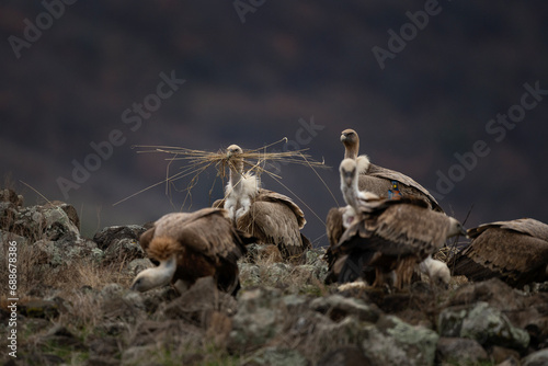 Griffon vulture in Rhodope mountains. Gyps fulvus on the top of Bulgaria mountains. Ornithology during winter time. Huge brown bird with white neck. Vultures is building nest.