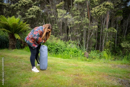 gril going camping with a tent in the bush. women hiking and camping in australia