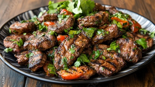 beef, grilled, steak, cube, food, meat, dinner, tasty, delicious, healthy, protein, cookery, lunch, summer, bar-b-q, party, garden, herb, cilantro, parsley, tomatoes, cherry, vegetable, flavorful, juicy, tender, seasoned, marinade, platter, plate, dish, meal, receipe, cooked, eatery, dinnerware, savoury, grilled meat, grilling, closeup, dark