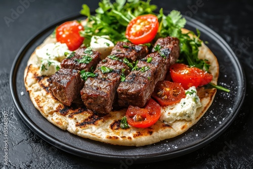 Grilled beef pita with feta and cherry tomatoes on dark plate