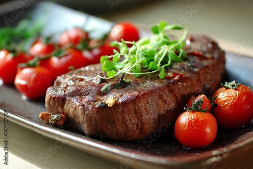 grilled beef steak with cherry tomatoes and fresh herbs served on black plate close-up showing juicy texture and appetizing presentation for delicious meal inspiration
