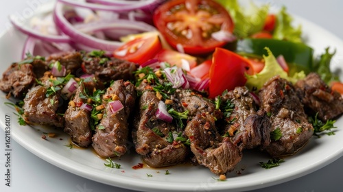 beef, grilled, strip, food, meal, meat, plate, vegetable, salad, tomatoes, onion, greener, fresh, healthy, dish, cookery, dinner, lunch, brown, red, green, closeup, closeup, isolated, eatery, food photography, grilled meat, protein, nourishment, appetising, delicious, flavorful, side dish, dinnerware, photo, image, cooking, prepare, preparing, kitchen, cooking ingredient