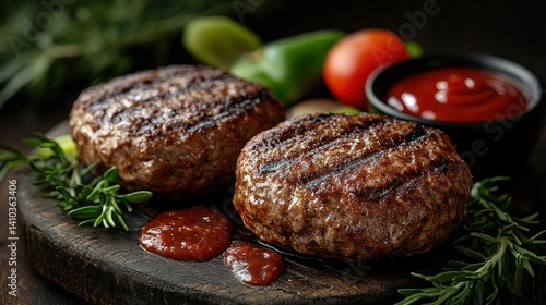 Grilled burgers on a wooden board with fresh vegetables and sauce in a rustic setting