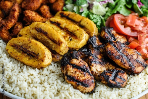 Grilled Chicken and Plantains with Rice and Salad - A Delicious Meal for Dining or Culinary Promotion