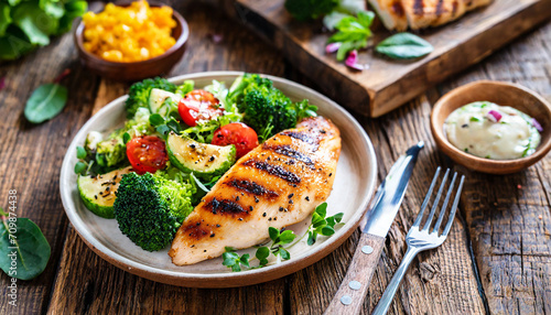Grilled chicken breast, chicken fillet and fresh vegetable salad, broccoli closeup on wooden table. Healthy lunch menu. Healthy food, keto diet, dieting concept
