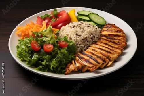 grilled chicken, brown rice, fresh vegetable, health food, protein, nourishment, salad, cucumber, tomatoes, lettuce, carrot, bell pepper, epicure, alimentary, healthy eating, dining, wholesome, flavorful, culinary, healthy lifestyle, dietary, homemade, lunch, weight loss, comfort food