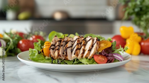 Grilled Chicken Breast with Mixed Greens and Balsamic Glaze on Marble Table in Bright Kitchen
