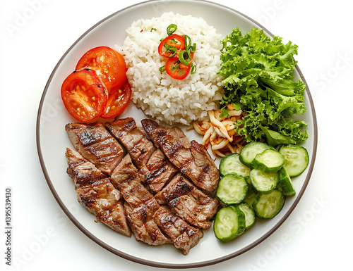 food, meat, meal, dinner, steak, beef, plate, dish, pork meat, salad, grilled, vegetable, tomatoes, roast, fried, lunch, roasted, cooked, cookery, green, white, epicure, red, delicious, eatery