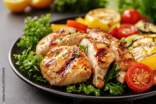 Grilled chicken breast with vegetables on a plate.