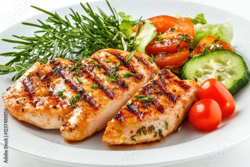 grilled, chicken, breast, salad, fresh, rosemary, tomatoes, cucumber, vegetable, healthy, diet, food, meal, dinner, lunch, cookery, plate, white, delicious, tasty, appetising, juicy, savoury, protein, carb, low, fat, summer, vibrant, colours, herb, garnish, cooking, receipe, eating, eatery, simple, elegant, presentation