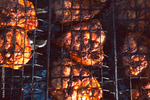 Grilled chicken. Chicken kebab outdoors. Chicken meat on an iron grill. Outdoor barbecue