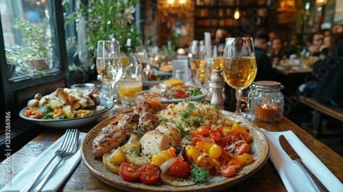 chicken, dinner, eatery, food, meal, grilled, table, plate, delicious, tasty, eat, cooking, dish, cookery, healthy, lunch, gastronomy, wine, party, celebration, group, people, friends, gathering, enjoy, summer, spring, autumn, winter, lifestyle, background, blurred, wooden, tableware, cutlery, roasted, herb, vegetable, fresh, organic
