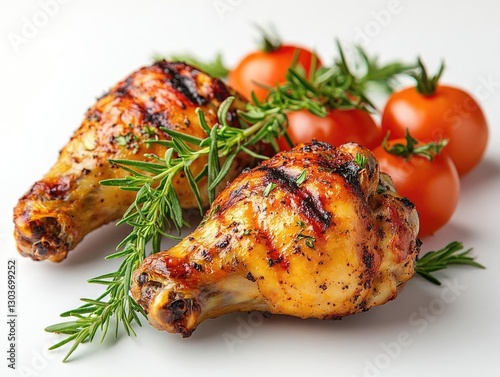 Grilled chicken drumsticks garnished with fresh rosemary and cherry tomatoes on a white background