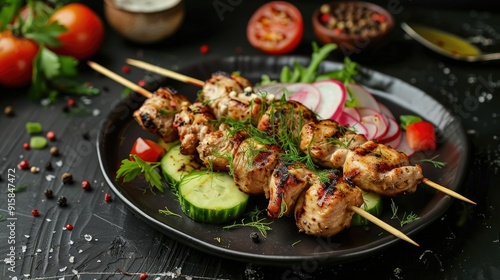 Grilled chicken kebab and salad with cucumber, radish, onion on a dark background.