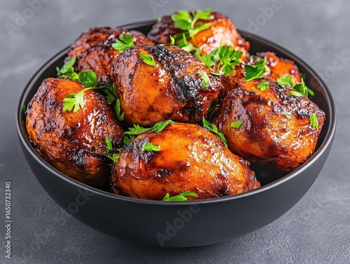 Grilled chicken pieces in bowl, kitchen counter, close-up