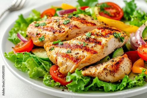 Grilled Chicken Salad on White Background Top Down Photo.generative ai
