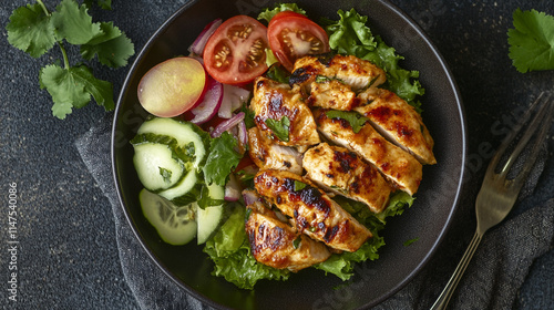 grilled chicken, salad, vegetable, lettuce, tomatoes, cucumber, onion, alimentary, grilled meat, balanced diet, epicure, cooking, cookery, dining, protein, appetising, organic, home cooking, wholesome, healthy eating, favor